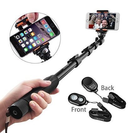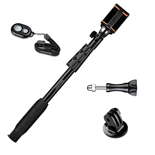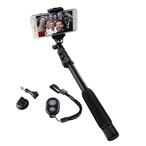 The Arespark is a truly compact aluminium selfie stick for GoPro, compact cameras, DLSR and all smartphones. Selfie Stick, Arespark Self-portrait Monopod Wireless Bluetooth Selfie Stick With Adjustable Phone Holder is crammed with so many amazing features; you can hardly resist it. First, it can extend from 16 inches all the way to 50 inches — it’s the longest GoPro stick you’ll ever come across as it enables you to view a vast back sight. Its 180 degrees rotating angle allows you to to get the right angles for the perfect selfie capture. With regards to safety, it has three great clamps on the monopod to ensure it doesn’t fall off without warning. Its grooved monopod enhances stability while the grip on top of the monopod increases handle firmness. It is also worth noting that it has a built-in wrist strap which prevents it from falling. Moreover, the Bluetooth remote control is separate and not integrated to ensure that it can be used underwater.