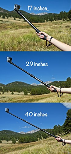 The GoRad Gear GoPro Stick is one of the most sought after devices thanks to its superior design and amazing features. It is an extension pole that boasts of a CNC aluminium thumbscrew and aluminium compatible tripod mount that connects to GoPro Hero 4, 3, 2 and 1 cameras for perfect shots. It has a twist locking system and an adjustable pole from 17 inches all the way to 40 inches. This means that it can also be used as a camera grip when it is folded, as a pope Mount for POV footage and as a follow-cam when fully extended. It is worth appreciating that it is specially made from waterproof materials making it an ideal partner for outdoor activities and underwater adventures. Additionally, it comes with an extra nylon carry bag with zippered compartment, adjustable shoulder strap and cinch-cord opening for you to keep your selfie stick safe and take it wherever you go.